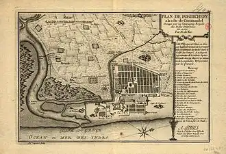 Plan de Pondichéry dressé par Nicolas de Fer, datant de 1705 et publié par la Compagnie des Indes. La ville occupée par les Hollandais de 1693 à 1700, est partiellement reconstruite par eux selon un plan en damier. Les Français achèveront le projet hollandais, dont l'origine véritable a été découverte en 2004, à Amsterdam, par Jean Deloche, chercheur à l'Institut français de Pondichéry.