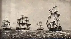 Le chef d'escadre Anne Antoine d'Aché livre trois combats navals près de Pondichéry en 1758-1759 avant d'abandonner la région à la Royal Navy. Tableau de Lawson Dunn.