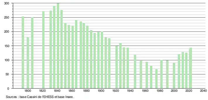 L'évolution du nombre d'habitants est connue à travers les recensements de la population effectués dans la commune depuis 1793. Pour les communes de moins de 10 000 habitants, une enquête de recensement portant sur toute la population est réalisée tous les cinq ans, les populations de référence des années intermédiaires étant quant à elles estimées par interpolation ou extrapolation[17]. Pour la commune, le premier recensement exhaustif entrant dans le cadre du nouveau dispositif a été réalisé en 2006[18].