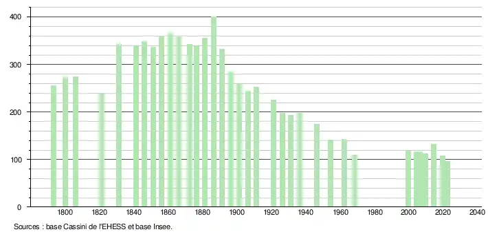 | L'évolution du nombre d'habitants est connue à travers les recensements de la population effectués dans la commune depuis 1793. Pour les communes de moins de 10 000 habitants, une enquête de recensement portant sur toute la population est réalisée tous les cinq ans, les populations de référence des années intermédiaires étant quant à elles estimées par interpolation ou extrapolation[19]. Pour la commune, le premier recensement exhaustif entrant dans le cadre du nouveau dispositif a été réalisé en 2004[20]. En 2022, la commune comptait 97 habitants[Note 2], en évolution de −28,15 % par rapport à 2016 (Gers : +1,04 %, France hors Mayotte : +2,11 %). |