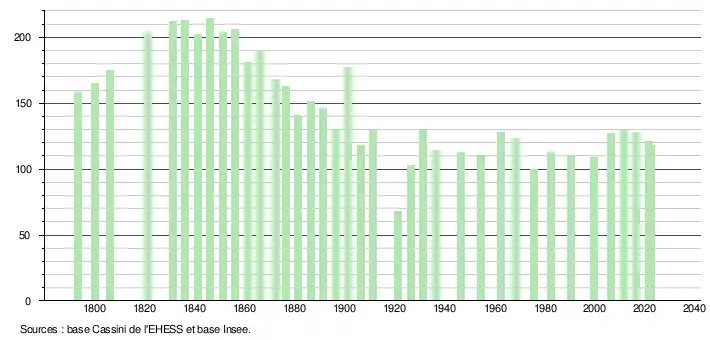 L'évolution du nombre d'habitants est connue à travers les recensements de la population effectués dans la commune depuis 1793. Pour les communes de moins de 10 000 habitants, une enquête de recensement portant sur toute la population est réalisée tous les cinq ans, les populations de référence des années intermédiaires étant quant à elles estimées par interpolation ou extrapolation[24]. Pour la commune, le premier recensement exhaustif entrant dans le cadre du nouveau dispositif a été réalisé en 2006[25].