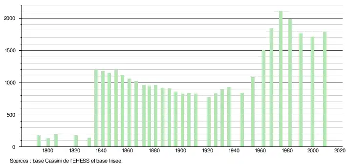 - ↑ Dans le tableau des recensements et le graphique, par convention dans Wikipédia, le principe a été retenu, pour les populations légales postérieures à 1999 de n’afficher dans le tableau des recensements et le graphique que les populations correspondant à l'année 2006, première population légale publiée calculée conformément aux concepts définis dans le décret no 2003-485 du 5 juin 2003, et les années correspondant à une enquête exhaustive de recensement pour les communes de moins de 10 000 habitants, ainsi que la dernière population légale publiée par l’Insee.