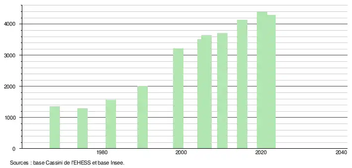 L'évolution du nombre d'habitants est connue à travers les recensements de la population effectués dans la commune depuis 1968. Pour les communes de moins de 10 000 habitants, une enquête de recensement portant sur toute la population est réalisée tous les cinq ans, les populations de référence des années intermédiaires étant quant à elles estimées par interpolation ou extrapolation[42]. Pour la commune, le premier recensement exhaustif entrant dans le cadre du nouveau dispositif a été réalisé en 2005[43].