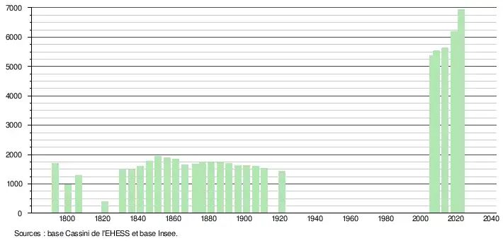 L'évolution du nombre d'habitants est connue à travers les recensements de la population effectués dans la commune depuis 1793. Pour les communes de moins de 10 000 habitants, une enquête de recensement portant sur toute la population est réalisée tous les cinq ans, les populations de référence des années intermédiaires étant quant à elles estimées par interpolation ou extrapolation[25]. Pour la commune, le premier recensement exhaustif entrant dans le cadre du nouveau dispositif a été réalisé en 2008[26].
