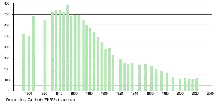 L'évolution du nombre d'habitants est connue à travers les recensements de la population effectués dans la commune depuis 1793. Pour les communes de moins de 10 000 habitants, une enquête de recensement portant sur toute la population est réalisée tous les cinq ans, les populations de référence des années intermédiaires étant quant à elles estimées par interpolation ou extrapolation[16]. Pour la commune, le premier recensement exhaustif entrant dans le cadre du nouveau dispositif a été réalisé en 2006[17].