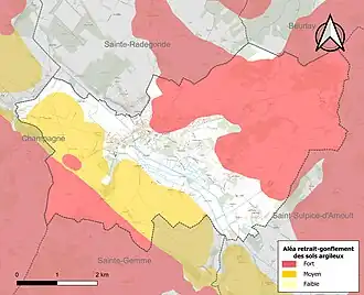 Le retrait-gonflement des sols argileux est susceptible d'engendrer des dommages importants aux bâtiments en cas d’alternance de périodes de sécheresse et de pluie. 69,1 % de la superficie communale est en aléa moyen ou fort (54,2 % au niveau départemental et 48,5 % au niveau national). Sur les 902 bâtiments dénombrés sur la commune en 2019, 295 sont en aléa moyen ou fort, soit 33 %, à comparer aux 57 % au niveau départemental et 54 % au niveau national. Une cartographie de l'exposition du territoire national au retrait gonflement des sols argileux est disponible sur le site du BRGM[13],[Carte 2].