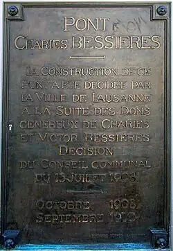 Charles Bessières décède le . Cinq jours plus tard, dans sa séance du , le Conseil communal de Lausanne décide d'accepter le legs, de donner le nom de Charles-Bessières au pont et d'ajourner la construction du pont Cité-École de Médecine. Le don supplémentaire de 50 000 francs de son frère Victor sept ans plus tard (auxquels s'ajoutent 400 francs à distribuer aux ouvriers de l'entreprise) permet aux travaux de débuter le . Le pont est inauguré le en présence de Victor et de sa sœur Charlotte Bessières.