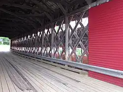 Le toit du pont est à deux versants recouverts de tôle ondulée. Le lambris du pont est composé de planches à clins peintes en rouge; plusieurs détails comme les planches cornières et les chambranles sont quant à eux peints en blanc[6]. Les linteaux des deux côtés sont à angles obliques et il possède deux longues ouvertures latérales[4],[6].