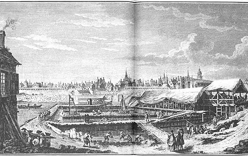 1753 : fondations des piles 5, 6 et 7 et de la culée du côté du faubourg