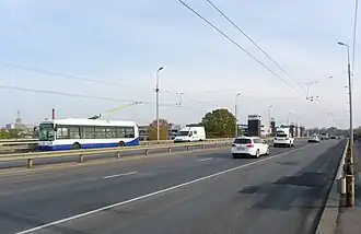 Plusieurs itinéraires de transports publics urbains (bus et des trolleybus) traversent le pont. Lors de la construction du pont, des voies de tramway ont été posées dans les deux sens, étaient destinés à la ligne de tramway prévue vers Purvciems et Pljavnieki. En fait, ces rails n’ont jamais été utilisés[1]. Dans le cadre du projet de renovation du pont, les rails seront retirés en 2023-2024[2].