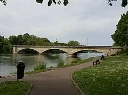 Vus depuis l’île aux Dames, le pont Neuf de Mantes, en béton et métal, et en arrière-plan la collégiale Notre-Dame de Mantes-la-Jolie. La fin de la dernière reconstruction du pont Neuf date de 1951. | ||||