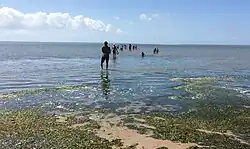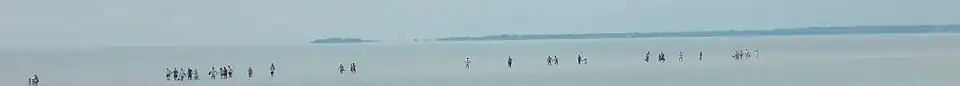 Le pont d'Yeu à marée basse, l'île d'Yeu est en vue au loin à gauche. | |