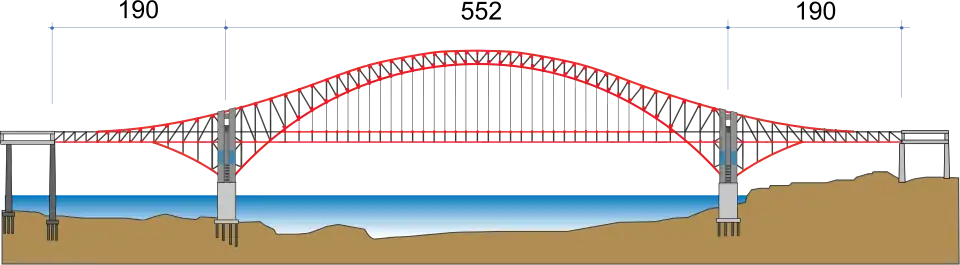 Le pont principal est un pont en arc de type bow-string à trois travées continues. Les travées latérales sont constituées de treillis de hauteur variable, et la travée du milieu est un arc en treillis en acier encastré à chacune de ses extrémités. La hauteur entre le sommet de l’arc et le milieu de la travée est de 142 m. La corde de l’arc inférieur est une parabole de 128 m au sommet, et l’élancement, le ratio hauteur /travée, de est 1/4,3125. La poutre centrale est constituée d’un treillis en N (type poutre Pratt) de hauteur variable. Celle-ci est de 14 m est à mi-travée et de 11,83 m en extrémité. Du fait de cette hauteur variable, les montants des panneaux du treillis ont des longueurs respectives de 12 m, 14 m et 16 m[3].