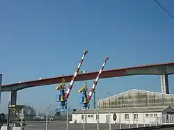 L’épisode le plus spectaculaire fut la pose du tablier. Ce dernier a été construit d'une pièce à Saint-Nazaire. Il a ensuite remonté la Loire sur une barge. Le morceau de 162 mètres de long a ensuite été gruté à 50 mètres de haut pour y être accroché sur les deux viaducs.