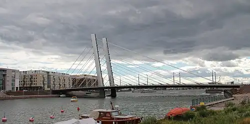 Le pont est un pont à haubans de 173,5 mètres de long est utilisé pour la circulation douce, la circulation automobile et par la ligne de tram 8.