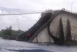 Néanmoins, ces travaux n'empêchent pas l'écroulement soudain du pont le de la même année vers 17 h 45[3]. L'accident fait deux morts, un Paluan et un Philippin[15], et quatre blessés[2],[6],[8],[9]. Les études des débris recoupées avec des témoignages ont conduit a élaborer le scénario le plus probable de l'écroulement[6]. En premier lieu, la partie supérieure du pont au niveau de la pile du côté de Babeldaob subit un délaminage sur une dizaine de mètres de longueur ce qui force la partie inférieure entre la pile et le centre du pont à se comporter comme une poutre rigide incapable de gérer les forces de cisaillement[2],[6]. Le tablier se brise alors à hauteur de la pile du côté de Babeldaob et la travée brisée s'appuie contre l'autre moitié de la travée centrale, obligeant la pile du côté de Koror à supporter une trop grande compression[6]. L'ensemble du tablier s'écroule alors dans le chenal lorsque cette pile cède à la suite de l'apparition de deux fractures de part et d'autre ainsi que son écrasement à sa base, terminant l'effondrement du pont[6], qui n'a duré que quelques secondes[2]. L'enquête terminée en 1998[14] n'a cependant pas permis de déterminer les causes de l'effondrement, notamment en raison des arrangements hors tribunaux entre le gouvernement paluan et les ingénieurs incriminés[6]. Les causes les plus probables sont les variations nycthémérales des températures ou un mauvais alignement des joints de compression mais l'effondrement n'a apparemment pas été causé par les autres travaux effectués sur le pont ni par l'emploi d'un béton de mauvaise qualité[2].
