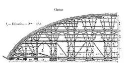 Il y a trois étages de pièces équarries : l’étage supérieur a vingt-et-une fermes reposant sur une ligne de coins qui servent à régler la hauteur des fermes, puis à décintrer. Les deux autres étages n’ont que onze fermes. Les palées de l’étage inférieur reposent sur des plateformes en maçonnerie de ciment de 20 m de longueur En trois mois, on a approvisionné le bois et construit le cintre avec 40 charpentiers, puis il a été monté en 14 semaines[S 2].