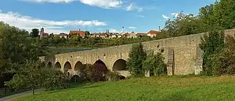 Le pont double avec ses deux rangées d'arcs superposés a été construit vers 1330. Il est situé au sud-ouest de la vallée sous la ville de Rothenburg ob der Tauber et faisait partie d'une route commerciale reliant Augsbourg à Wurtzbourg. Son aspect le fait ressembler à un aqueduc de l'époque romaine. Le pont a été rénové en 1791, après l'effondrement des quatre arcs supérieurs l'année précédente. En 1925, la partie est du pont fut élargie et, en 1945, la structure fut détruite par les troupes allemandes. La reconstruction commença en 1955 et dura une année. Le pont reconstruit a été inauguré le 10 novembre 1956.