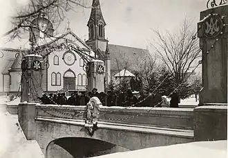 « En 1879, les paroissiens souhaitent construire une église plus grande. Ils doivent pour cela traverser les pierres sur le fleuve en hiver, mais un temps doux les empêche d'exécuter ce travail. Ce n'est qu'au soir du 16 mars qu'un passage de glace se forme d'une rive à l'autre du fleuve, sur une distance d'environ deux kilomètres. Du 19 au 25 mars, on effectue le transport de la pierre avec une centaine de voitures tirées par des chevaux. Les gens qui ont charrié la pierre sur ce pont de glace l'ont eux-mêmes baptisé le pont des Chapelets[2]. »