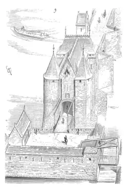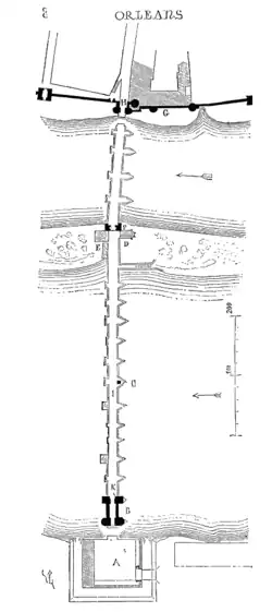 Un second pont-levis est pratiqué en avant de la porte H de la ville. Une vue perspective de l'architecte français Eugène Viollet-le-Duc présente l'entrée du pont d'Orléans, avec son boulevard sur la rive gauche, du côté de la Sologne, après les réparations faites depuis le siège de 1428.