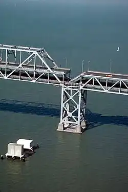C'est à la fin des années 1980, avec le tremblement de terre de Loma Prieta, d'une magnitude de 6,9 que les autorités constatèrent à quel point un tremblement de terre pouvait être dangereux, non seulement pour les personnes, mais aussi pour les ouvrages. Le Loma Prieta fit 62 victimes, et plus de 3 000 blessés, et un total de dégâts matériels estimé à plus de cinq milliards de dollars. Parmi les constructions touchées par la catastrophe figure le Bay Bridge[38], construit à la même époque que le pont du Golden Gate, et en partie par les mêmes équipes. Un tronçon complet du pont, qui relie la baie de San Francisco à la ville voisine d'Oakland s'écroula. Le séisme, dont l'épicentre se trouvait dans les montagnes de Santa Cruz[38] à environ 80 kilomètres du pont, eut donc principalement des répercussions dans la baie de San Francisco.