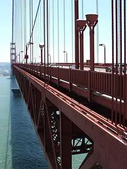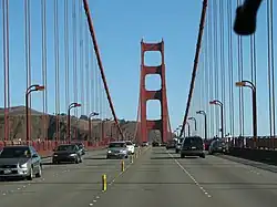 Le pont du Golden Gate est en outre un point de passage routier de premier ordre, qui permet de relier la ville de San Francisco aux autres grands centres de la Californie. D'une largeur de 30 m, il offre six voies de circulation ouvertes au trafic automobile et deux allées réservées aux piétons de chaque côté. Les plots centraux entre les voies de circulation peuvent même être déplacés en fonction du trafic routier. L'allée côté est est réservée aux piétons et l'allée ouest aux cyclistes (sauf en période de travaux). Ces deux allées sont fermées du soir à l'aube.