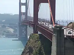 Le pont du Golden Gate (litt. « Pont de la porte dorée ») est un pont suspendu américain situé dans l'État de Californie, traversant le Golden Gate, détroit par lequel la baie de San Francisco débouche dans l'océan Pacifique. Il permet ainsi de relier la ville de San Francisco, située à la pointe nord de la péninsule de San Francisco, à la ville de Sausalito, située à la pointe sud de la péninsule du comté de Marin. Financée par la Work Projects Administration, sa construction, qui se heurte à de nombreuses difficultés, débute en 1933 et s’étale sur une durée de quatre ans, pour s'achever en 1937[1].