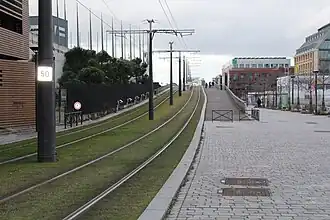 Une rame de tramway de la ligne T3b franchit le pont du canal de l'Ourcq devant les Grands Moulins de Pantin. | |||||