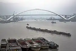 routier - ferroviaire | 420 | 1741 | Acier, béquilles béton tablier intermédiaire à 2 niveaux, des suspentes relient arc et tablier | 2x3 voies routières Ligne 3 (Métro de Chongqing) | Yangzi Jiang | 2007 | Chongqing (centre urbain) 29° 32′ 38″ N, 106° 32′ 52″ E | [S 11],[33] |