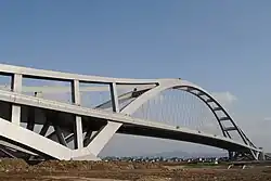 Des tirants rejoignent les deux extrémités de l'arc et reprennent en grande partie les efforts de flexion. À la différence des ponts en arc, les ponts de type bow-string transmettent des efforts verticaux sur leurs appuis[19], ils sont donc souvent classés parmi les ponts à poutre, on peut trouver par ailleurs la dénomination poutre bow-string. Ces ouvrages peuvent être métalliques ou en béton ; ils s'adaptent à de nombreux domaines : ponts routes, ponts ferroviaires, passerelles. | ||