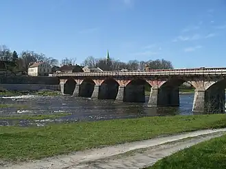 Le pont en brique sur la Venta est en service depuis 1874. Le pont en arc en maçonnerie de briques à sept travées de 164 m de long était non seulement le plus grand et le plus luxueux de Lettonie, mais aussi l'un des plus modernes d'Europe. Le pont était éclairé par des lanternes placées dans 6 lampadaires décoratifs en fonte dont les bases étaient en forme de poisson. La largeur du pont était suffisante pour que deux voitures se dirigeant l'une vers l'autre puissent s'y déplacer en même temps[2].