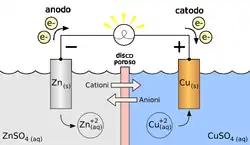 Dans la pile Daniell, l'anode est une lame de zinc plongée dans une solution de sulfate de zinc (incolore). La cathode est du cuivre plongé dans du sulfate de cuivre (solution bleue).