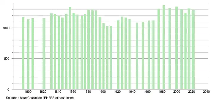 L'évolution du nombre d'habitants est connue à travers les recensements de la population effectués dans la commune depuis 1793. Pour les communes de moins de 10 000 habitants, une enquête de recensement portant sur toute la population est réalisée tous les cinq ans, les populations de référence des années intermédiaires étant quant à elles estimées par interpolation ou extrapolation[17]. Pour la commune, le premier recensement exhaustif entrant dans le cadre du nouveau dispositif a été réalisé en 2006[18].