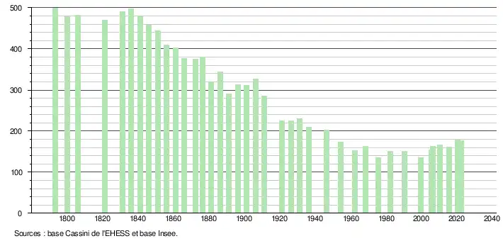 L'évolution du nombre d'habitants est connue à travers les recensements de la population effectués dans la commune depuis 1793. Pour les communes de moins de 10 000 habitants, une enquête de recensement portant sur toute la population est réalisée tous les cinq ans, les populations de référence des années intermédiaires étant quant à elles estimées par interpolation ou extrapolation[17]. Pour la commune, le premier recensement exhaustif entrant dans le cadre du nouveau dispositif a été réalisé en 2005[18].