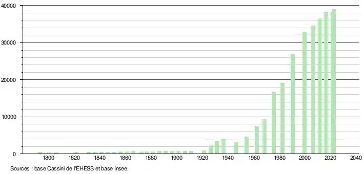 - ↑ Par convention dans Wikipédia, le principe a été retenu de n’afficher dans le tableau des recensements et le graphique, pour les populations de référence postérieures à 1999, que les populations correspondant à une enquête exhaustive de recensement pour les communes de moins de 10 000 habitants, et que les populations des années 2006, 2011, 2016, etc. pour les communes de plus de 10 000 habitants, ainsi que la dernière population de référence publiée par l’Insee pour l'ensemble des communes.
