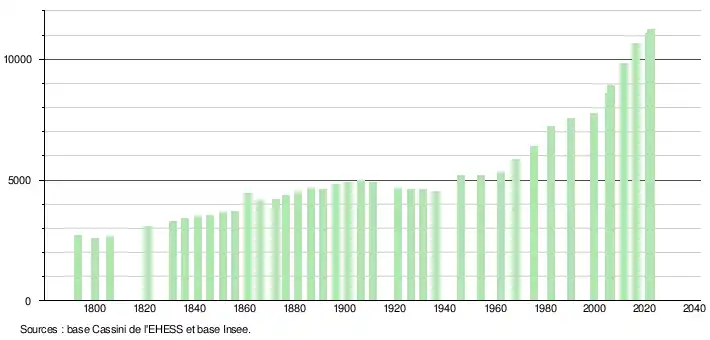 - ↑ Par convention dans Wikipédia, le principe a été retenu de n’afficher dans le tableau des recensements et le graphique, pour les populations de référence postérieures à 1999, que les populations correspondant à une enquête exhaustive de recensement pour les communes de moins de 10 000 habitants, et que les populations des années 2006, 2011, 2016, etc. pour les communes de plus de 10 000 habitants, ainsi que la dernière population de référence publiée par l’Insee pour l'ensemble des communes.