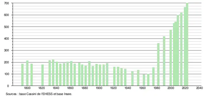L'évolution du nombre d'habitants est connue à travers les recensements de la population effectués dans la commune depuis 1793. Pour les communes de moins de 10 000 habitants, une enquête de recensement portant sur toute la population est réalisée tous les cinq ans, les populations de référence des années intermédiaires étant quant à elles estimées par interpolation ou extrapolation[19]. Pour la commune, le premier recensement exhaustif entrant dans le cadre du nouveau dispositif a été réalisé en 2004[20].