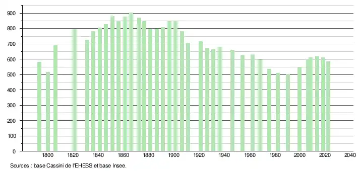L'évolution du nombre d'habitants est connue à travers les recensements de la population effectués dans la commune depuis 1793. Pour les communes de moins de 10 000 habitants, une enquête de recensement portant sur toute la population est réalisée tous les cinq ans, les populations de référence des années intermédiaires étant quant à elles estimées par interpolation ou extrapolation[33]. Pour la commune, le premier recensement exhaustif entrant dans le cadre du nouveau dispositif a été réalisé en 2008[34].