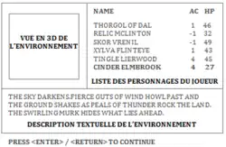 Lors des phases d'exploration, l'environnement s'affiche en trois dimensions avec un rectangle en haut à gauche de l'écran qui affiche ce que voit le groupe, le reste de l'écran étant occupé par des informations textuelles concernant le groupe et la zone explorée[15]. Le joueur peut accéder à des menus pour donner des ordres à ses personnages : utiliser, échanger, acheter ou vendre un objet, parlementer avec un ennemi, et apprendre ou lancer un sort. Il peut observer les déplacements des personnages selon différents angles, incluant une vue aérienne[16]. Le jeu utilise trois versions de chaque sprite pour indiquer la différence de distance qui sépare le groupe des prochaines rencontres[2].