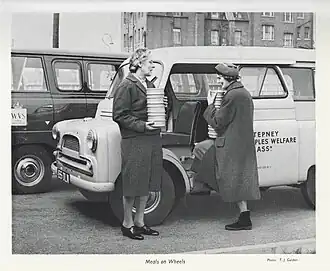 Durant la Seconde Guerre mondiale, le Royaume-Uni fut l'un des premiers pays les plus touchés par les pertes de vie et les dégâts causés par les multiples bombardements. Pour aider la population civile à surmonter les nombreuses difficultés, le Womens Voluntary Service (WVS) est formé. Un de ses principaux mandats est l'organisation des services alimentaires d'urgence. À la fin des hostilités, le gouvernement demande au WVS de poursuivre son œuvre auprès des prisonniers et des aînés. Ainsi, en 1947, à Welwyn Garden City, dans le comté de Worcestershire, les premières popotes roulantes sont livrées.