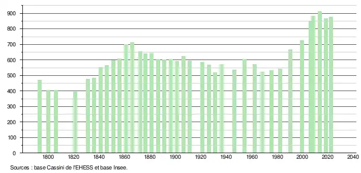 L'évolution du nombre d'habitants est connue à travers les recensements de la population effectués dans la commune depuis 1793. Pour les communes de moins de 10 000 habitants, une enquête de recensement portant sur toute la population est réalisée tous les cinq ans, les populations de référence des années intermédiaires étant quant à elles estimées par interpolation ou extrapolation[27]. Pour la commune, le premier recensement exhaustif entrant dans le cadre du nouveau dispositif a été réalisé en 2008[28].