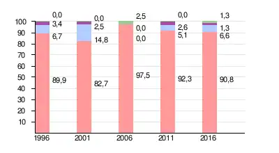 Le conseil municipal est formé d'une mairesse et de quatre conseillères générales[8]. Le conseil précédent, formé à la suite de l'élection du , a en effet la particularité d'être formé entièrement de femmes[15]. Le conseil municipal actuel est élu lors de l'élection quadriennale du [8].