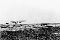 À l'hiver de 1912-1913, le site fut étudié et la construction d'un quai débuta au printemps, suivie de la construction de bâtiments et d'autres infrastructures durant l'été. Le tout nouveau navire de recherche canadien CSS Acadia été envoyé d'Halifax pour cartographier le port et les approches à l'été 1913 et 1914. Cependant, le projet de port dans son ensemble était semé d'embûches. Les pénuries matérielles, les conflits de travail, les tempêtes, les incendies et les accidents de bateau ont entraîné des retards importants. Un autre revers a été la nécessité de repenser complètement le port car le fleuve Nelson envasait rapidement les deux côtés du quai. On opta plutôt pour la construction d'une île artificielle situé près du chenal principal de la rivière reliée au continent par un pont en treillis de 17 travées construit par la Dominion Bridge Company de Montréal[1]. Une épave se trouve actuellement sur l’île.