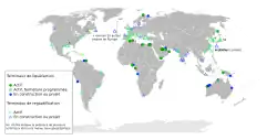 53 terminaux méthaniers sont en 2008 actifs dans le monde, dont 1 en Belgique (Port de Zeebrugge) 3 en France (Montoir-de-Bretagne et 2 à Fos-sur-Mer, avec 4 projets de port méthanier en cours d'étude ou de construction dans ce pays, à Dunkerque au Havre et deux à Bordeaux). En 2023, un terminal méthanier flottant démarre son exploitation au Havre.