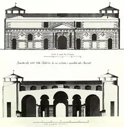 L'aspect actuel du monument a également subi d'autres modifications, dues aux interventions survenues au cours du XIXe siècle pendant l' occupation autrichienne, notamment sur la façade côté campagne. En effet, en 1852, les deux grands arcs latéraux furent ajoutés, avec une rupture de rythme entre le portail central et les deux plus petits latéraux[1] ; un couloir de liaison a également été ouvert depuis l'ouverture mineure à droite vers les pièces intérieures et, sur le front vers la ville, les deux ouvertures rectangulaires sur les côtés du fronton ont été fermées[18]. Cette intervention, qui n'annulait pas mais apportait une nouvelle contribution au monument d'origine, en restant fidèle à sa conception et à sa technique de construction, peut être identifiée par le « niveau beaucoup plus bas » du parement en pierre de taille[19].