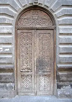 Dans la baie de porte extérieure d'architecture classique, une table saillante et un bossage de pierre de taille avec refends marquent les contours et constituent le bandeau de portes des demeures (élégantes). Un fronton peut exister.