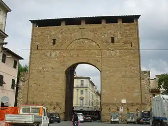 La porte (faisant partie de la sixième enceinte de remparts bâtie entre 1284 et 1333) a été construite entre 1332 et 1334 donnant accès à la route de Pise, selon un projet attribué à Andrea Pisano. D'après ses dimensions actuelles, ce devait être la porte la plus majestueuse de la ceinture murale, mais elle est demeurée inachevée en hauteur ; elle a été rabaissée et renforcée dans les années précédant le siège de Florence par les troupes impériales, afin de l'adapter aux nouvelles nécessités militaires dues à l'usage des canons et des nouvelles armes à feu.