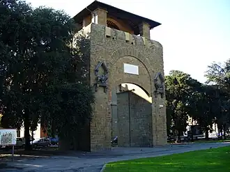 C'était l'une des portes de la ville qui supportait le trafic le plus intense, car elle était la plus au nord, reliée à la route de Bologne. Sur la porte, dont les clés sont encore conservées au Musée de Florence, une inscription rappelle la fondation du bâtiment en 1285 à l'instigation du capitaine Guelfe Rolandino da Canossa, tandis qu'une autre célèbre plus tard le passage du roi Frédéric IV du Danemark, qui en 1708 fut présent dans la ville. À l'extérieur, il est décoré de deux marzocchi, ou lions du Parti Guelfe, en pierre, tandis que dans la lunette intérieure il y a des traces d'une fresque avec la Vierge et les saints.