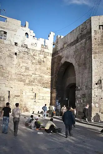 Porte principale à l'époque byzantine, elle est ensuite reconstruite à diverses reprises : elle est rebâtie par l'émir Saïf al-Daoula au Xe siècle et restaurée sous les fatimides au XIe siècle, et encore jusqu'en 1422. Deux tours massives[1] de défense sont construites par les Ayyoubides. Celle du sud renferme les restes du cheikh Ali al-Roumi.