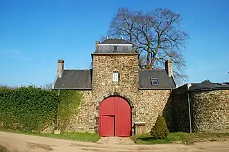 Cet édifice rectangulaire, coiffé d'une toiture en bâtière couverte d'ardoises, présente en son centre une tour carrée[4] ornée de chaînages d'angle et percée d'une grande porte cintrée à encadrement de pierre bleue (petit granit) dont la clé d'arc sculptée est encadrée d'une ancre de façade bifide.